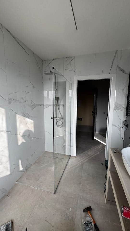 Ambiente moderno con marmo chiaro, tonalità antracite e illuminazione calda che crea un’atmosfera elegante e rilassante.